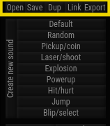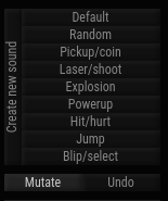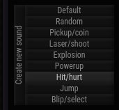 Jfxr te da opciones para el tipo de efecto de sonido a elegir. como por ejemplo, golpe/dañoo (hit/damage), moneda adquirida (coin collected)/potenciador (powerup), etc..