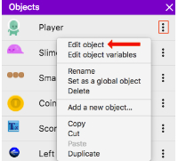 Añadir comportamiento al objeto Para agregar comportamiento a un objeto, como de costumbre, cree el objeto. Luego, abra las propiedades del objeto haciendo clic derecho en la lista de Objetos ubicada a la derecha de la Interfaz de Escena. Seleccione "Editar objeto" de la lista emergente.
