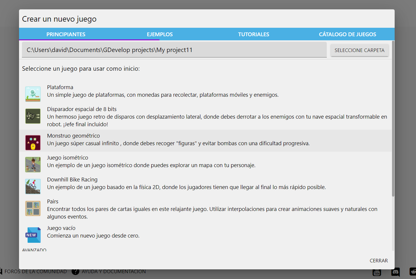 - Selecciona uno de los proyectos de la pestaña Principiantes, como Platformer o Space Shooter de 8 bits, o comienza un juego desde cero seleccionando el proyecto Vacío.