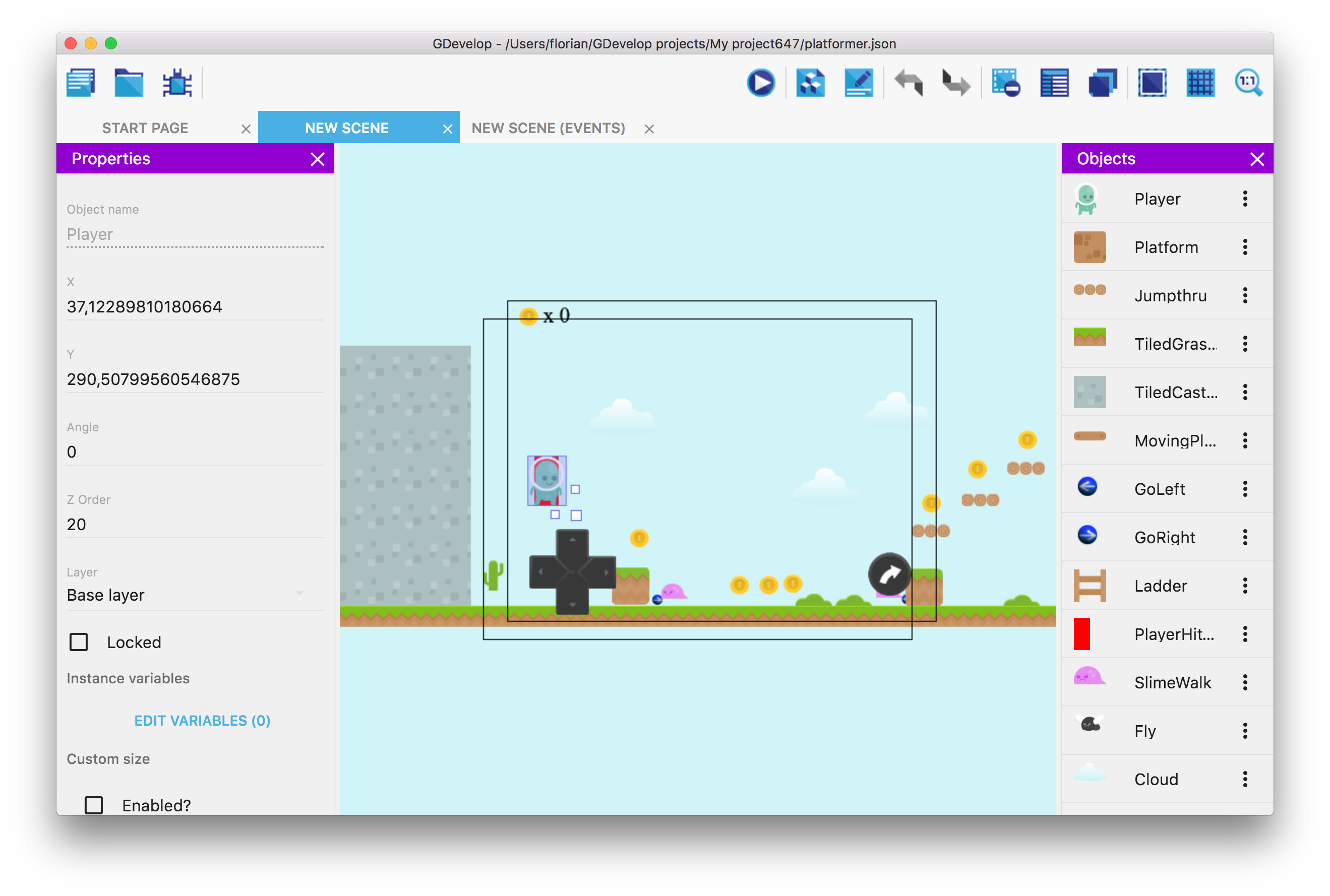 La interfaz de trabajo de GDevelop se basa en editores que se muestran en pestañas. Estos editores te permiten cambiar diferentes partes de tu juego.