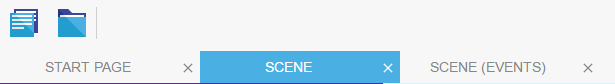 Para cambiar el Editor de Escena (Scene editor) y el editor de eventos, use las pestañas en la parte superior de la ventana.
