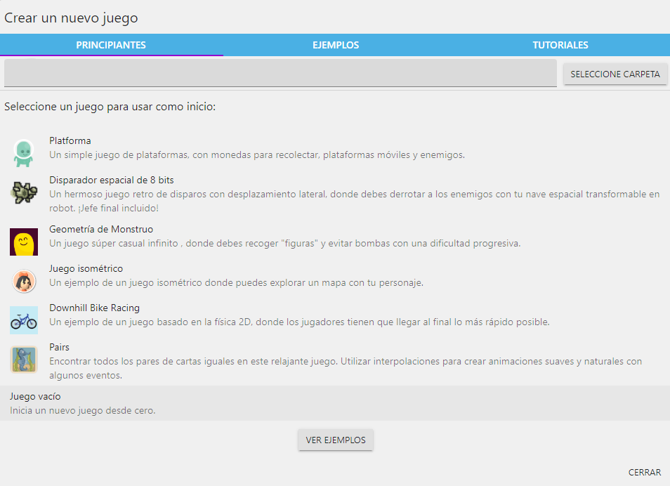 en la página de inicio. En la ventana, elija una carpeta para su proyecto y seleccione Proyecto Vacio o Empty Game