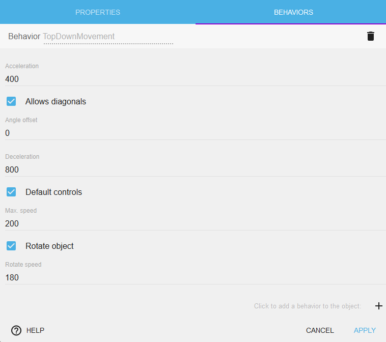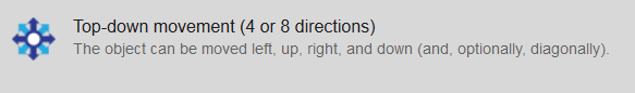 Le comportement "Top-down Movement" permet d'avoir la fonctionalité de déplacement d'un objet dans 4 ou 8 directions.