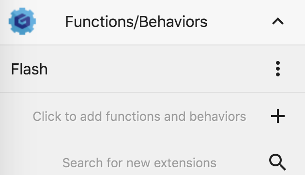 Trouver de nouveaux comportements, conditions, actions ou expressions pour votre jeu dans GDevelop est facile. Dans le Project Manager, clique sur "Functions/Behaviors", puis sur "Search for new extensions" :