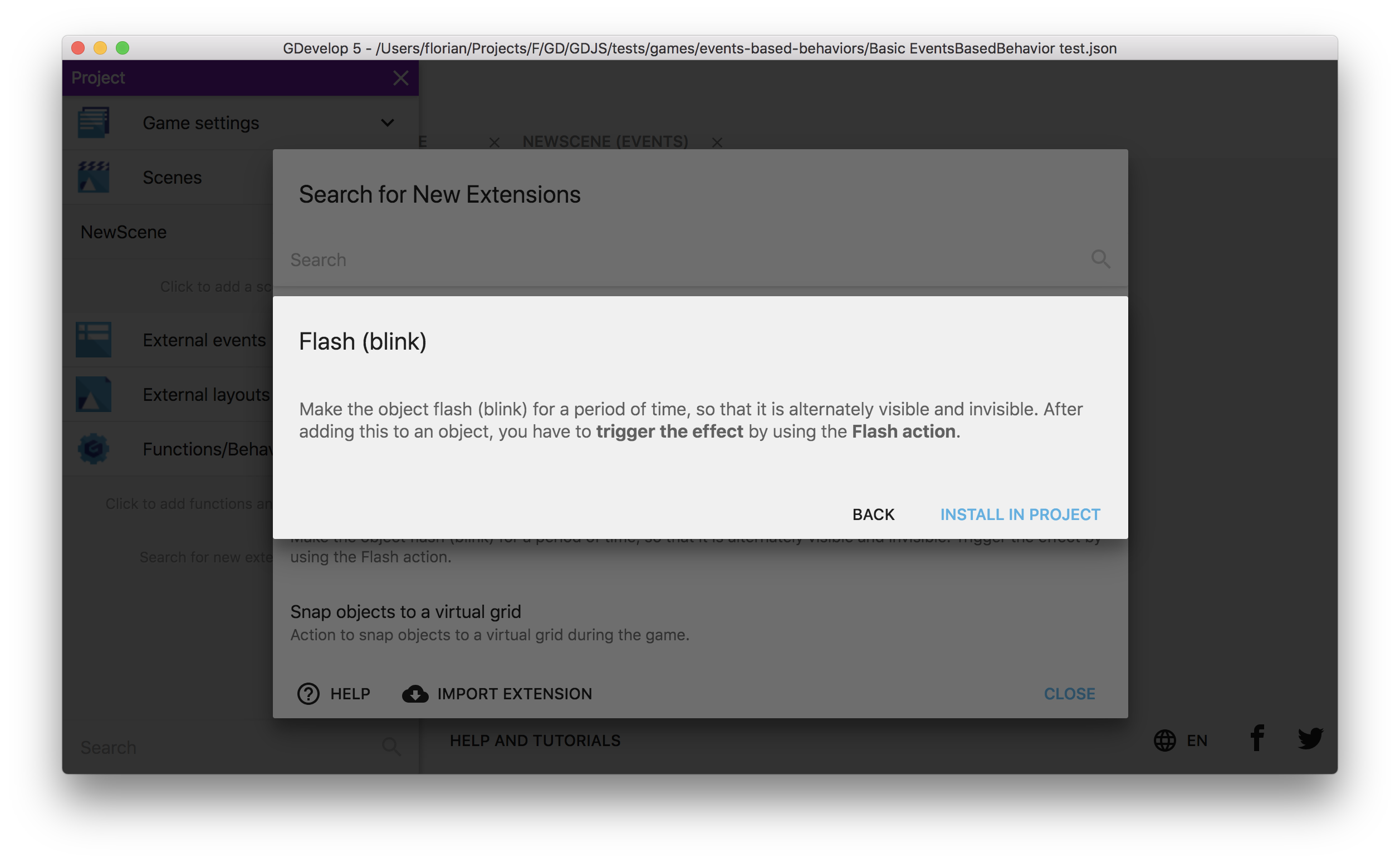 Cliquez sur Installer dans le projet pour télécharger l'extension. Vous pouvez voir qu'elle est alors ajoutée à la liste des comportements/fonctions dans le Project Manager :