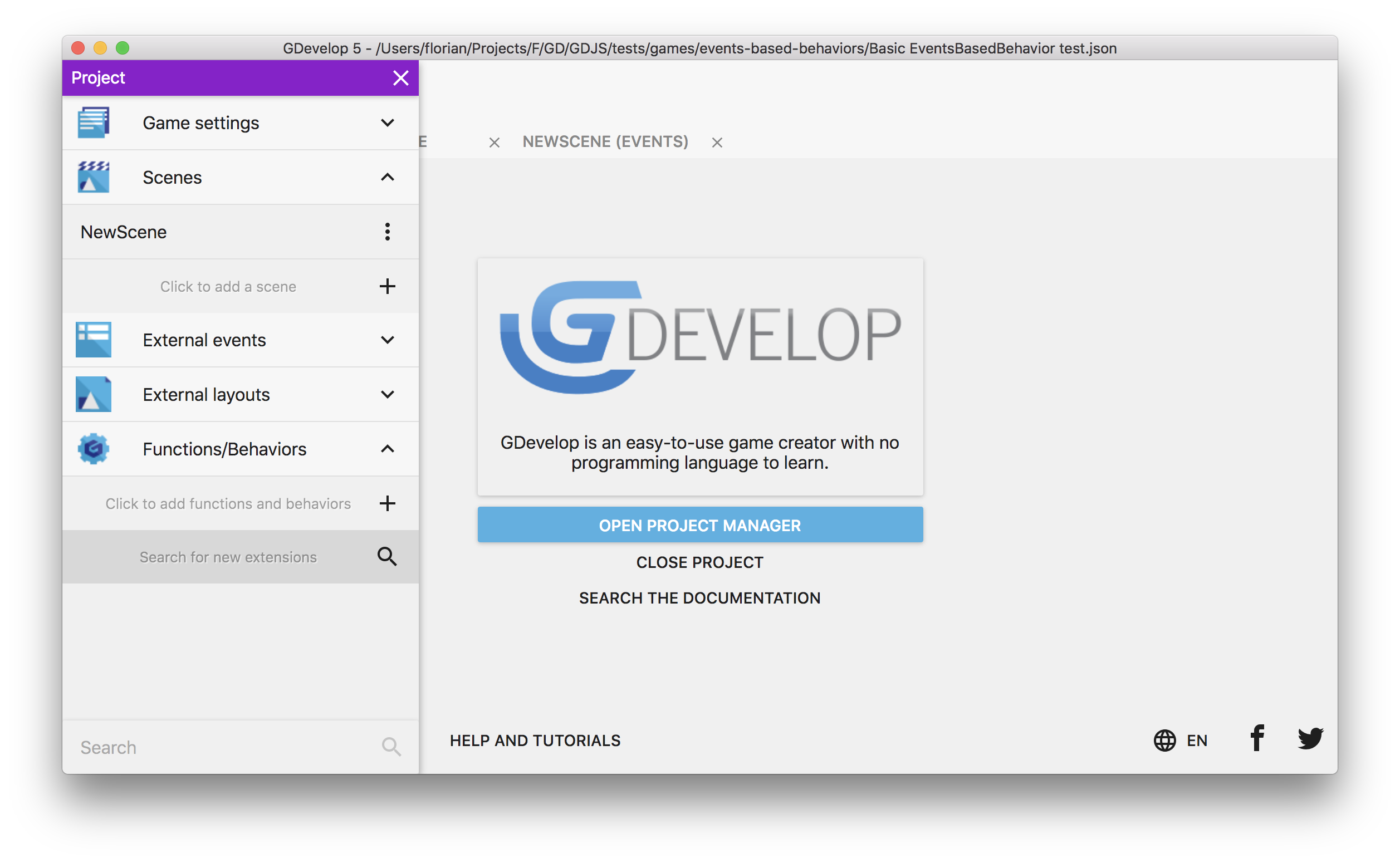 Une fois que vous avez sélectionné votre fichier et confirmé votre choix dans le sélecteur de fichiers, l'extension est ajoutée à votre projet. Les comportements/conditions/actions/expressions sont maintenant disponibles dans GDevelop avec les autres comportements ou événements.