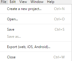Dans la version bureau, le menu Fichier vous permet de sauvegarder votre jeu, d'en ouvrir un autre ou de le fermer. Vous pouvez aussi exporter votre jeu.