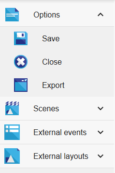 * Agencements externes: Comme pour les événements, vous pouvez décider que des agencements utilisés à diverses reprises méritent d'être conçus comme des agencements externes qui pourront être chargés à de multiples endroits de vos scènes.