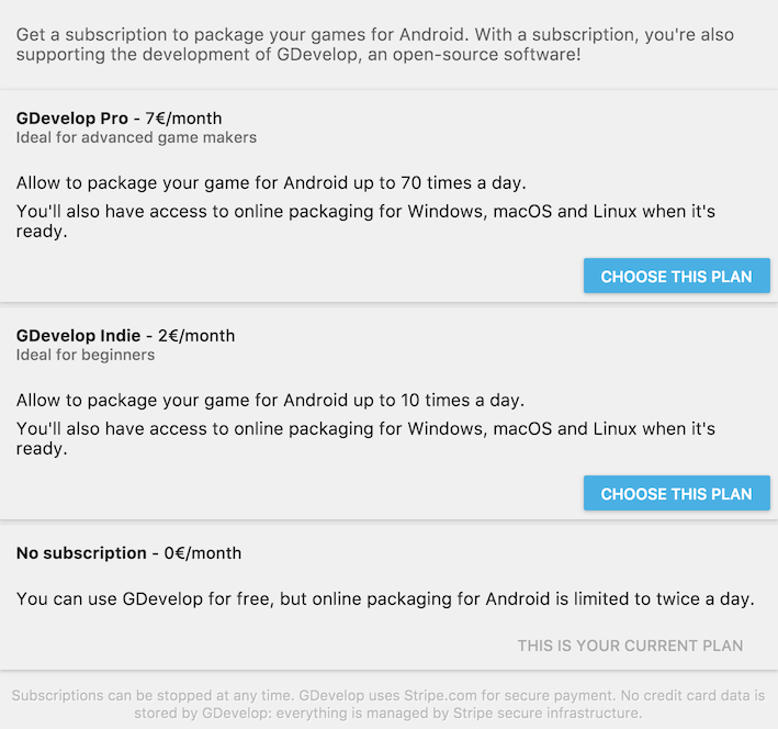 En obtenant un abonnement, vous débloquerez plus de packagings (et à l'avenir, plus de packagings en un clic pour iOS, Windows, MacOS et Linux! Vous soutiendrez également GDevelop pour le développement futur. ✨