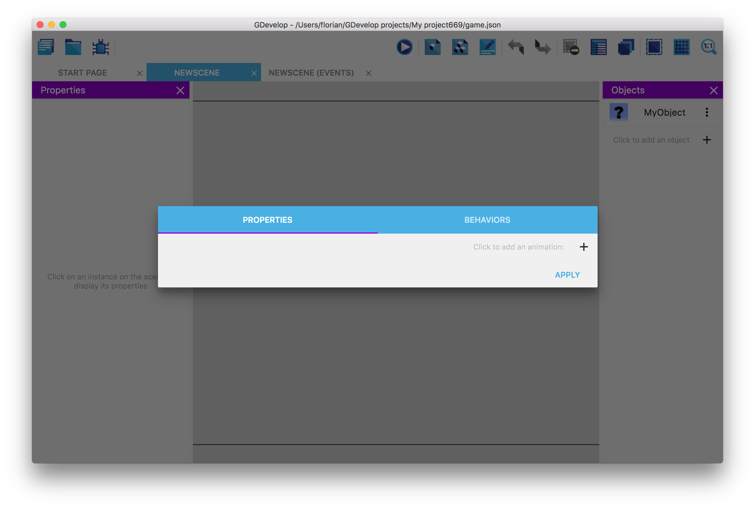 Une nouvelle scène, appelée NEWSCENE est ajoutée à la liste. Cliquez dessus pour l'ouvrir.