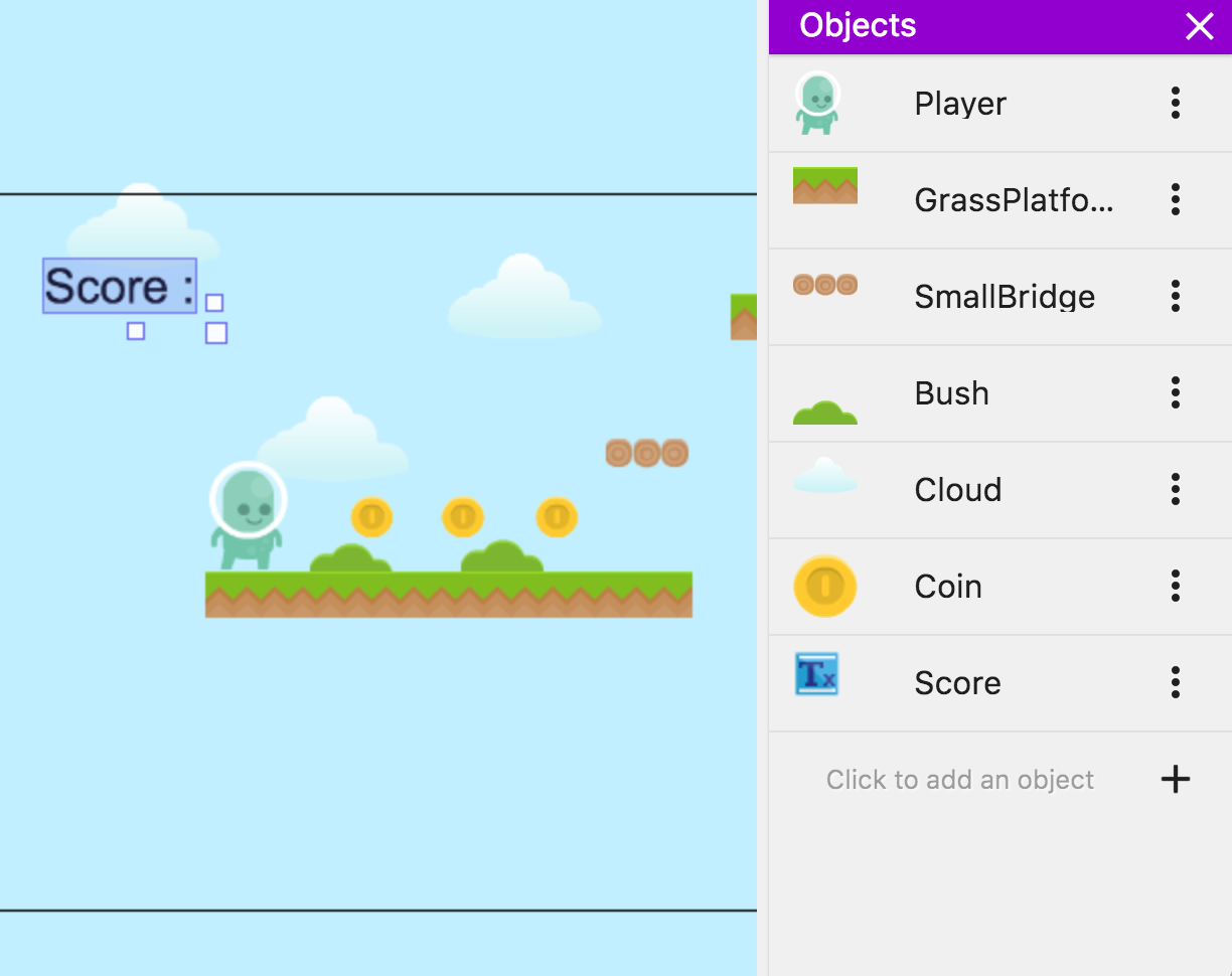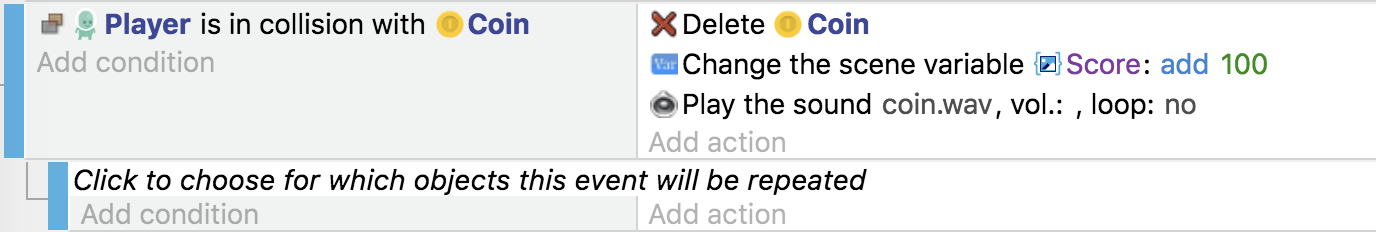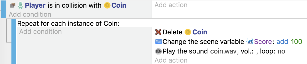 Vous avez peut-être remarqué que si vous collectez deux pièces en même temps, le score n'augmente que d'une unité. Par exemple, si chaque pièce vaut 100 points et que vous collectez 2 pièces, le score n'augmentera que de 100 au lieu de 200. La correction est facile ; il suffit d'utiliser une fonction que nous n'avons pas encore rencontrée : un événement appelé For each object. Cette fonction nous permet de dire au moteur du jeu qu'il doit ajouter 100 au score pour chaque pièce ramassée.