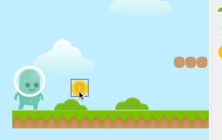 Vous pouvez placer plusieurs pièces de monnaie dans ce niveau. Si vous avez besoin de nombreuses pièces, il vaut la peine d'utiliser la technique drag and clone offerte par l'éditeur de scène : sélectionnez une pièce déjà placée sur la scène et, tout en maintenant la touche CTRL (ou CMD sur macOS), tirez la pièce avec la touche gauche de la souris. La pièce sera dupliquée à chaque relâché de la touche gauche.