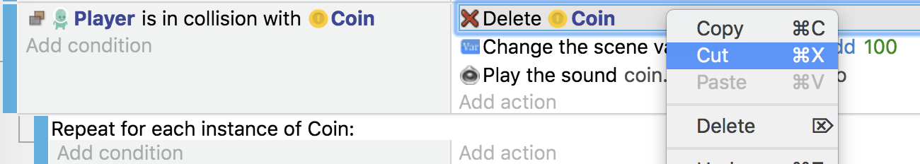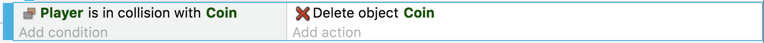 Il faut maintenant ajouter une action pour supprimer la pièce touchée. Seuls les objets Coin