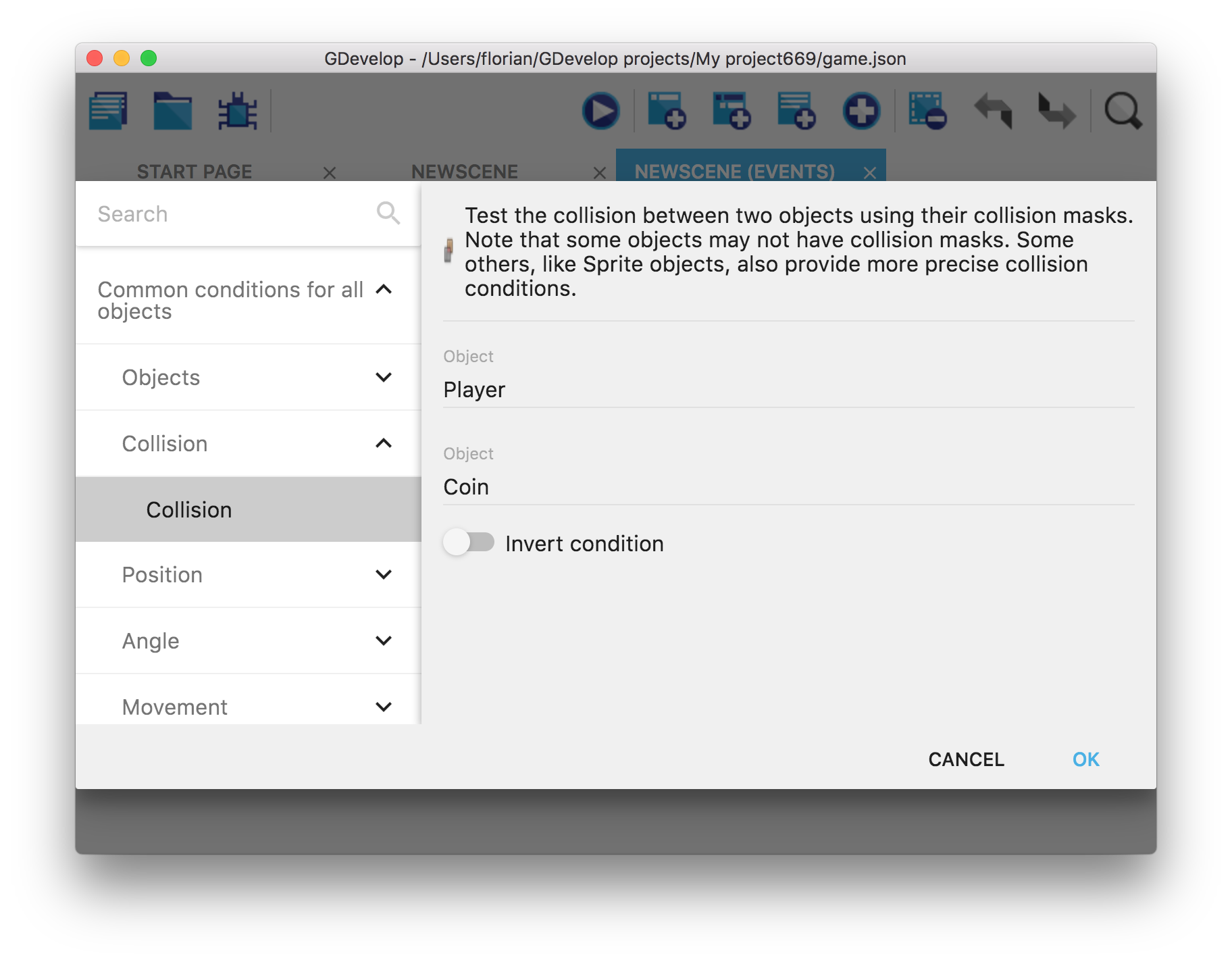 Créer un nouvel événement et ajoutez-y une nouvelle condition (Add condition). Sélectionnez Common conditions for all objects dans la liste de gauche, puis Collision et enfin Collision pour tester la survenue d'une collision entre deux objets. Sélectionnez Player