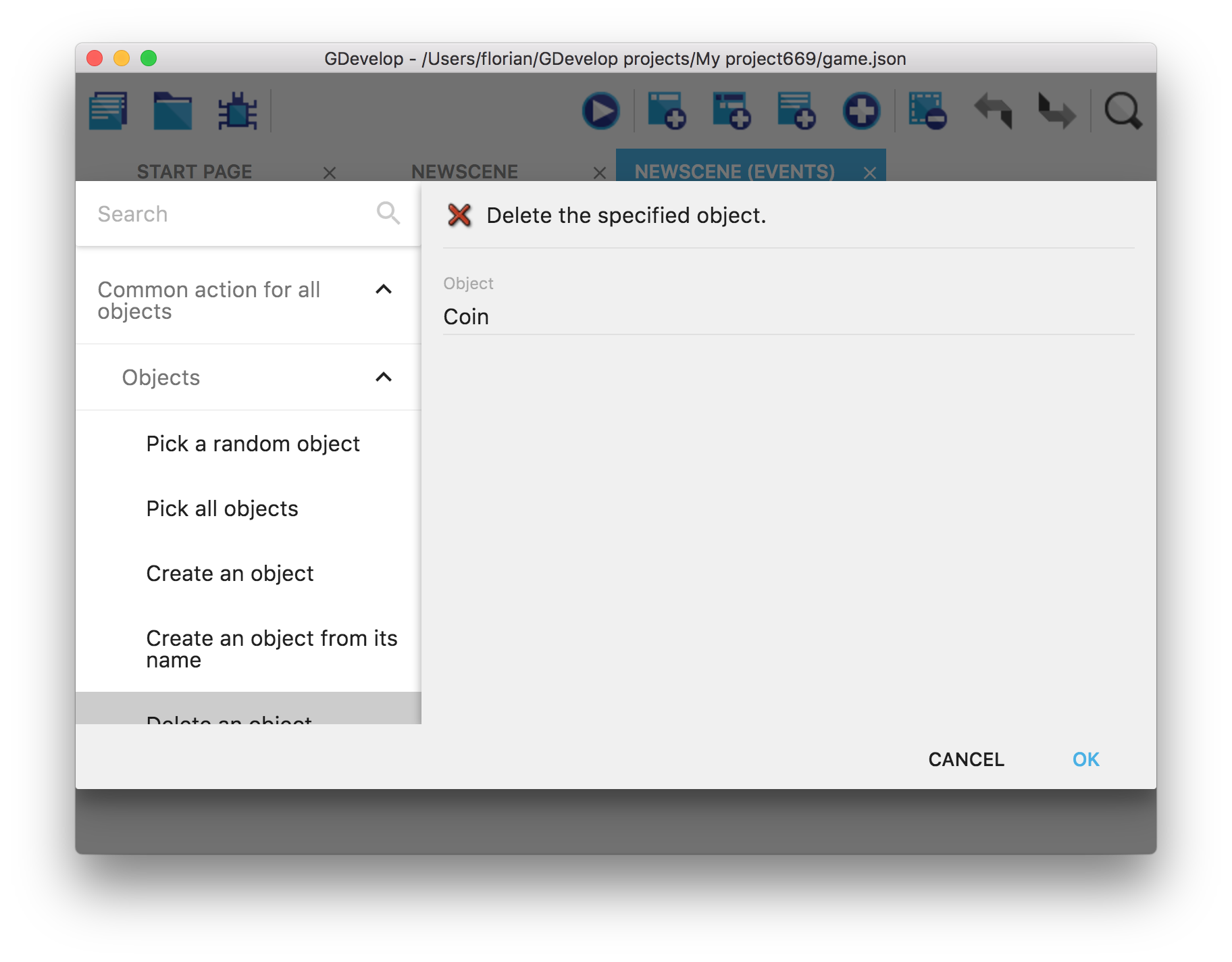 Activez les actions Add action et sélectionnez dans la liste de gauche Common action for all objects, Objects et Delete an object. Sélectionnez Coin