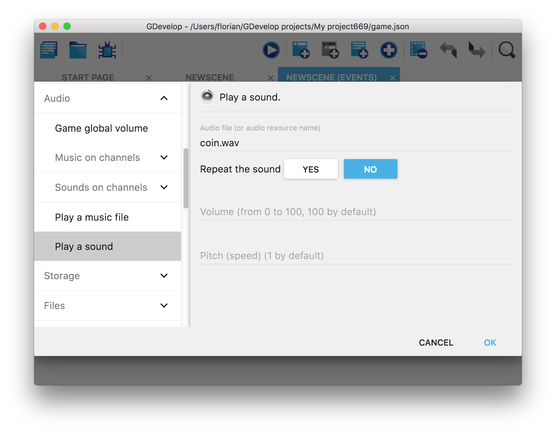 dans le premier paramètre. Laissez les autres paramètres tels qu'ils sont (par exemple, ne répétez pas le son, laissez le volume à 100 par défaut et le Pitch à 1 par défaut. )