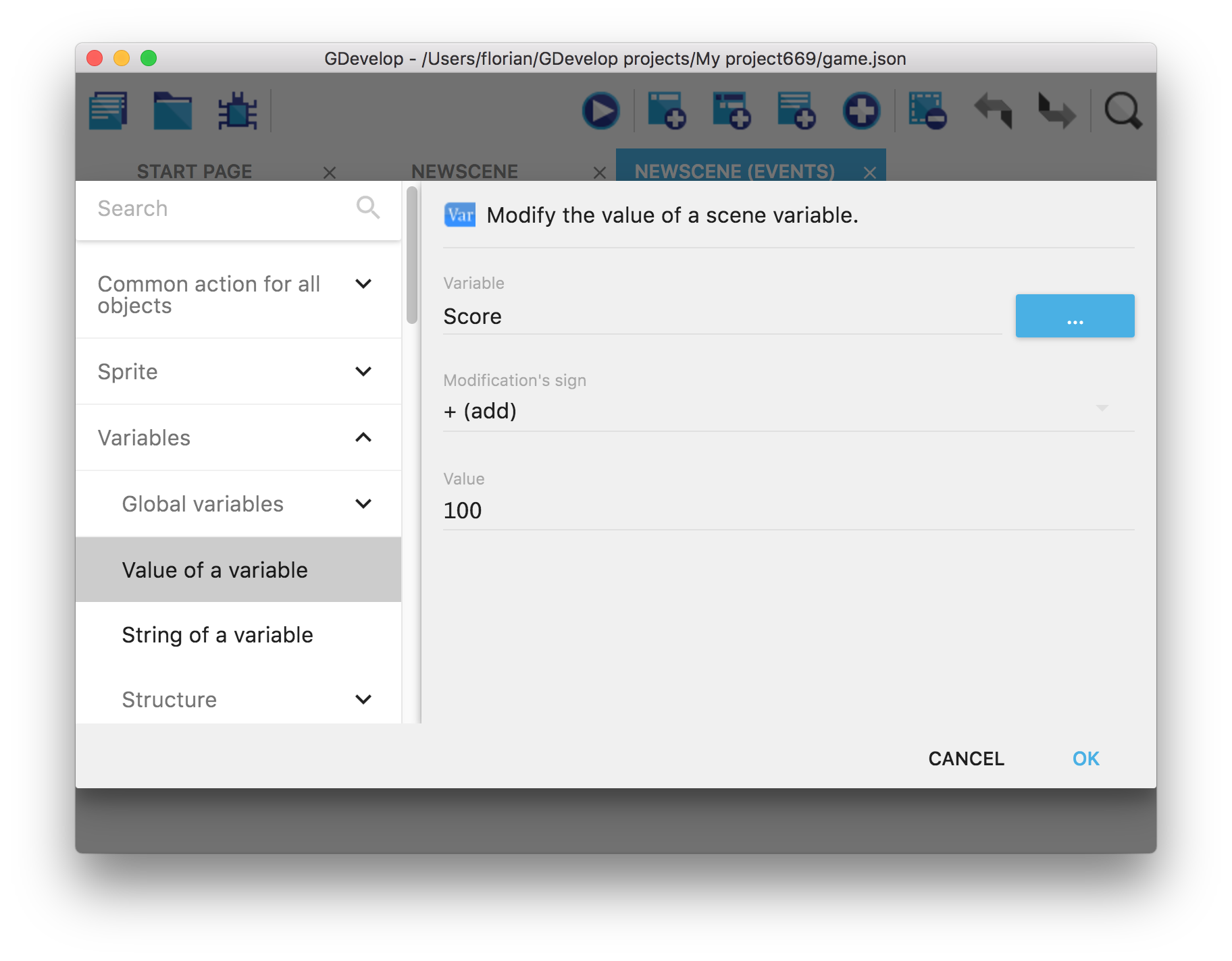 Ajoutons une action dans le dernier événement que nous avons créé. Sélectionnez l'action Variables > Value of a variable. Cette action sera utilisée pour ajouter 100 à la variable Score