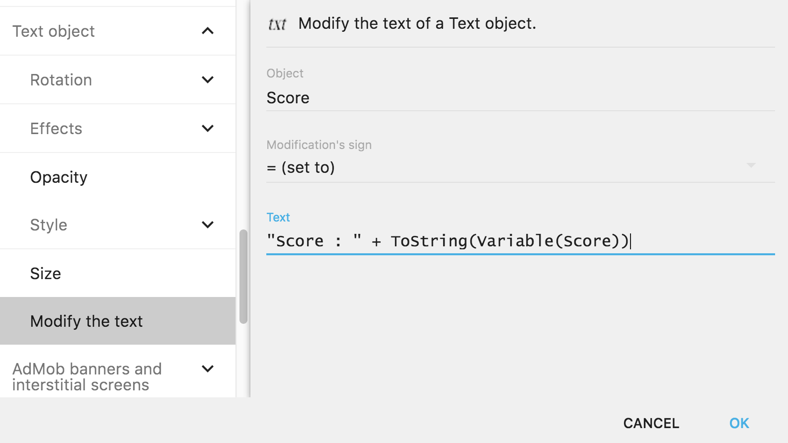 Finalement, le dernier paramètre représente le nouveau contenu du texte. Ce contenu est une expression de type chaîne de caractères qui sera évaluée par GDevelop pendant le jeu lorsque l'action sera exécutée.