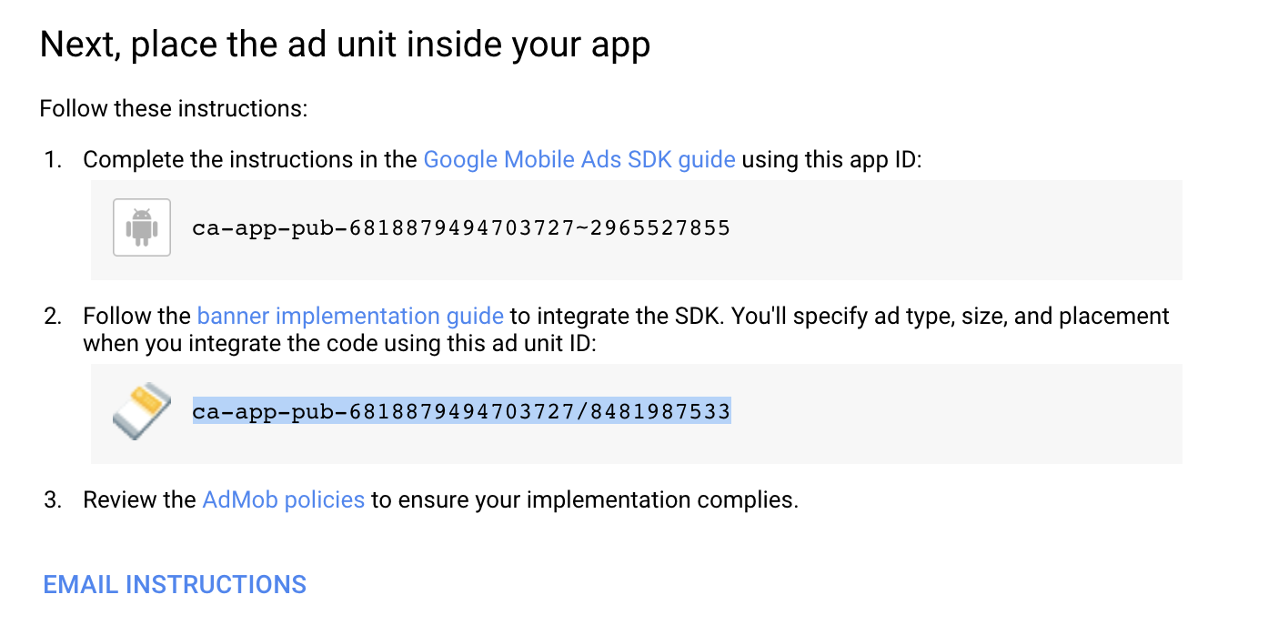 You will now see the app id and the ad unit identifier.