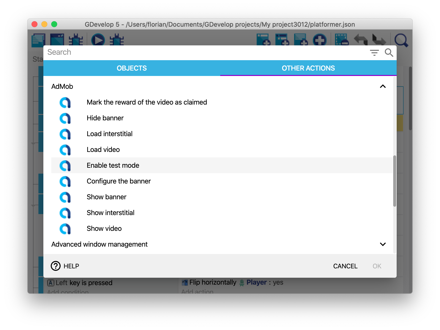 Once your game is set up with the app id, you can add an event with an action to show the ad unit that you've created. All actions can be found inside the AdMob category:
