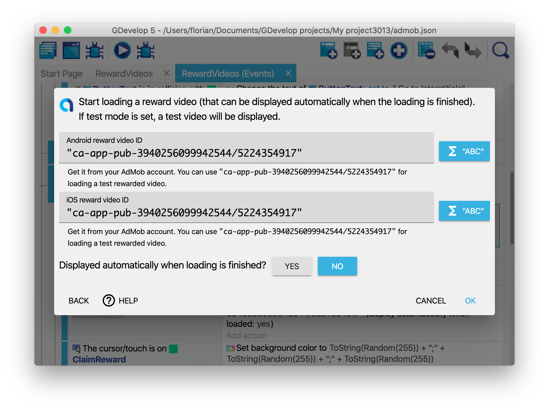In the action, paste the ad unit id in the parameters (one for Android and one for iOS). Because parameters are string expressions, you must put the ad unit identifier between quotes.