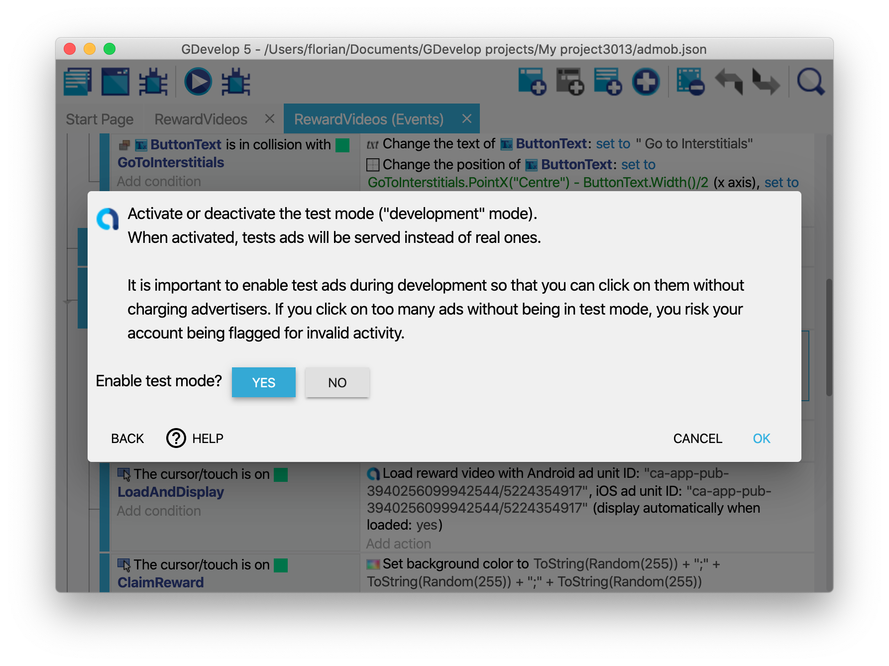 See how the ads work in a game by opening the example called AdMob. Replace the app id and the ad unit identifiers in the actions to test with your own account.
