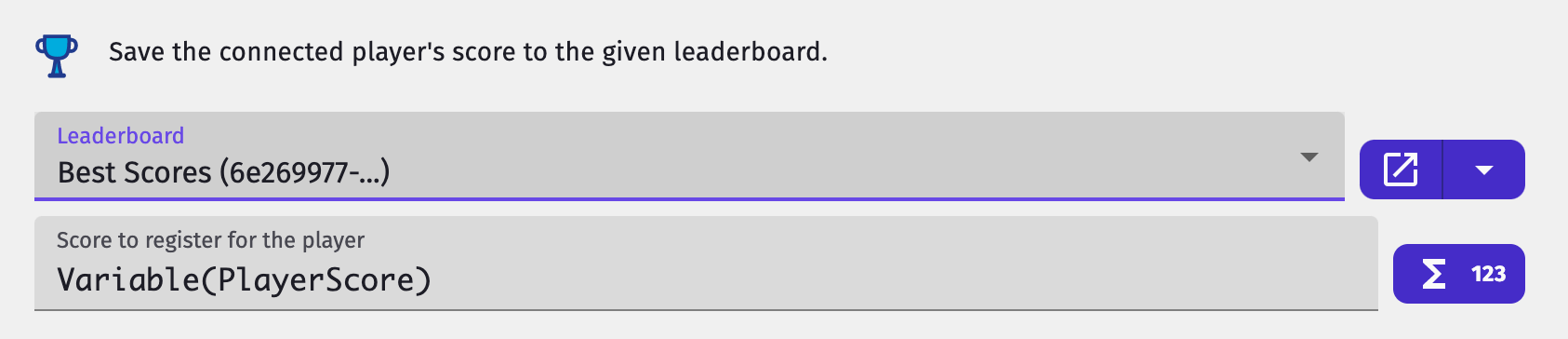 - Once it is done, you can either select the leaderboard you want to send the score to, or use an expression to define the unique id of the leaderboard (if it is stored in a scene variable for instance).
