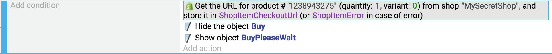 When you want the player, to open the page to buy a product, you must first get the URL to the product page, and then open it. The product identifier is needed for this, to let Shopify know which URL to generate. You also have to enter the name of the variable where the URL will be stored (as this can take a bit of time, depending on the network connection):
