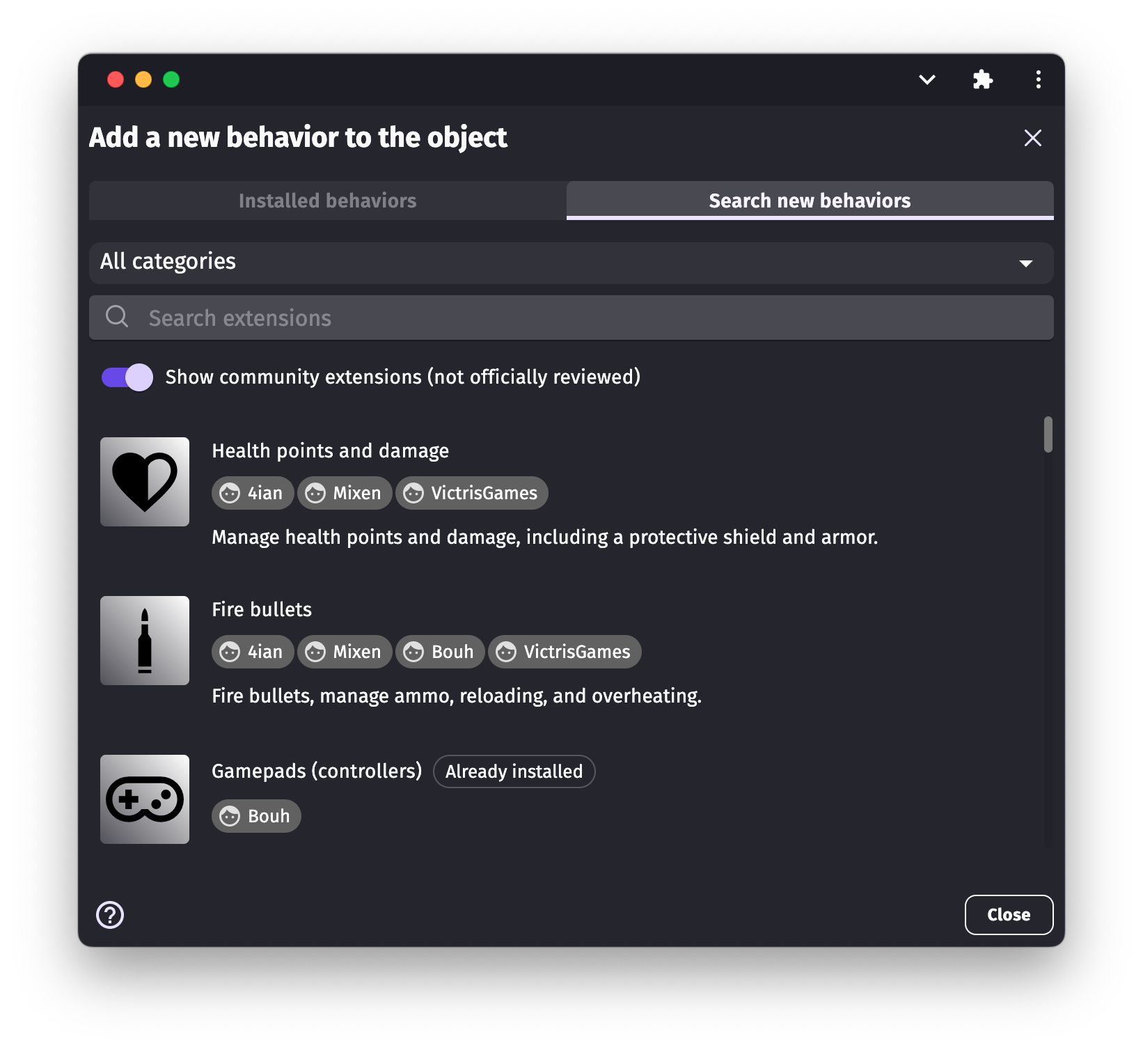 Anyone can create custom behaviors and share them with the GDevelop community.