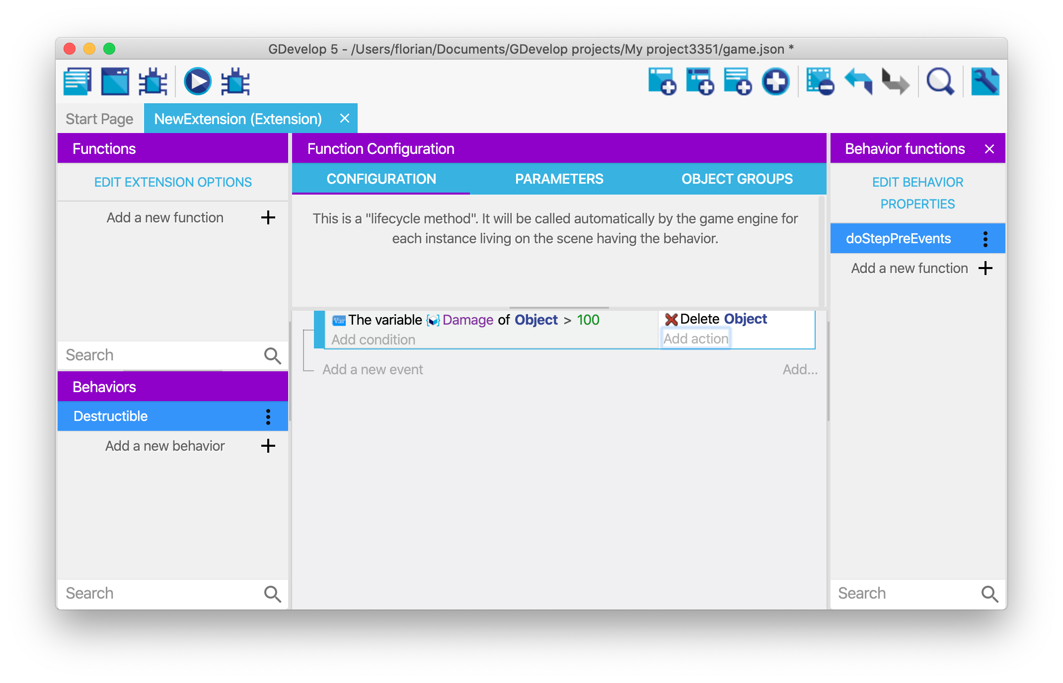 You can run the game and see that the events in "doStepPreEvents" function (or "doStepPostEvents") will be executed. In the example of the Destructible behavior that was created, if the "Damage" variable is set to a number greater or equal to 100, the object will be destroyed automatically.