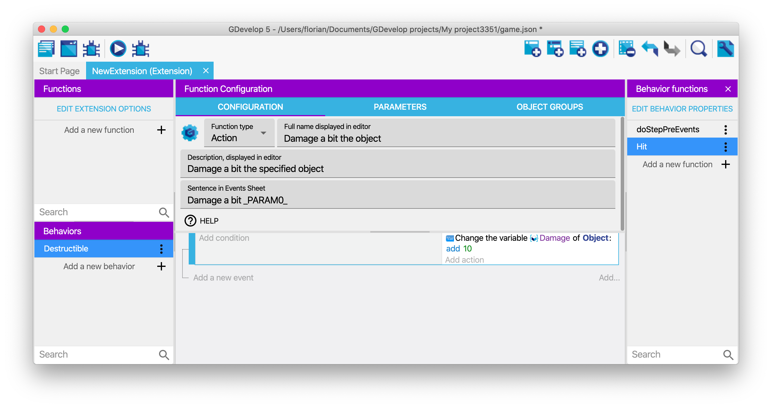 Like any other "built-in behavior", you can also use actions/conditions (or expressions) if you have declared functions as such in the behavior. For example, in the "Destructible" behavior, we created an action to cause some damage to the object. We can find it and use it in the events sheet: