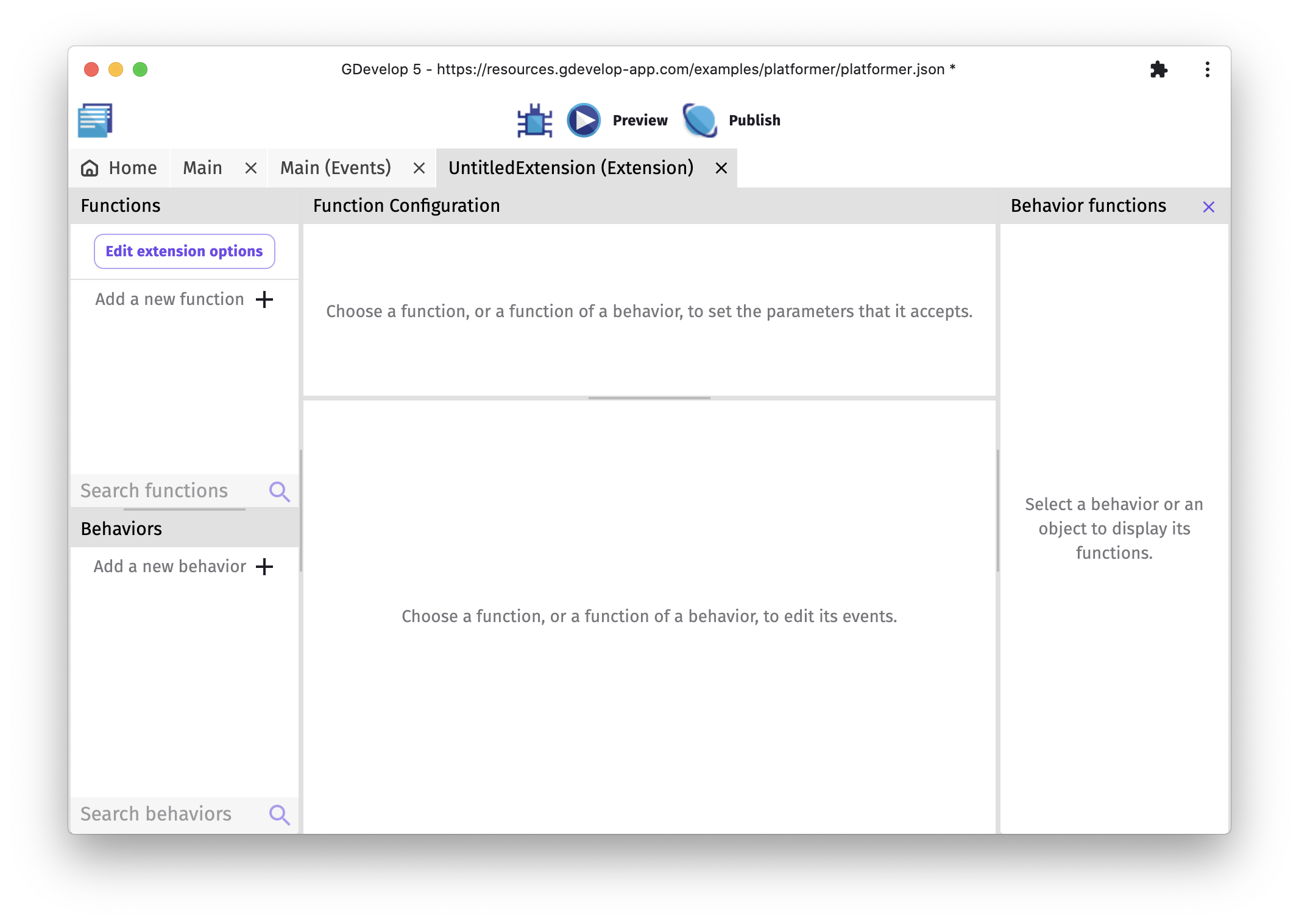 Click on the extension in the list to open its editor. By default, there are no functions in the extensions. Add one by clicking on "Add a new function", on the left: