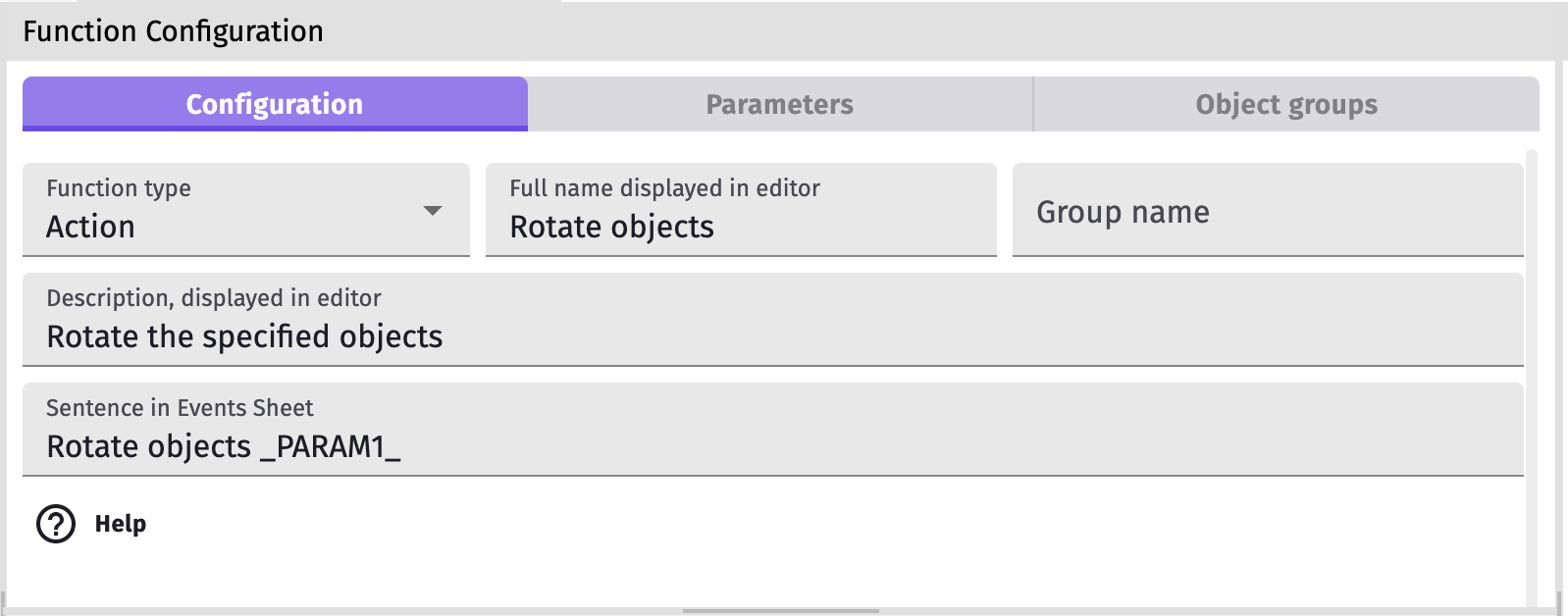 - For Action or Condition, you can enter the sentence that will be displayed in the events sheet. In case your function takes parameters (see below to learn more about these), you can include them by writing