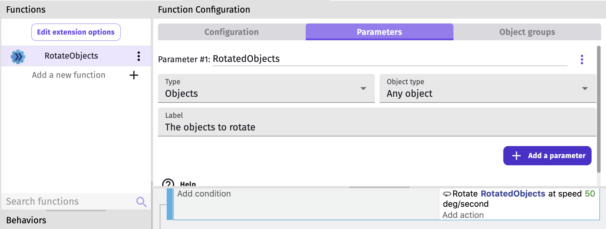 This is a really simple and not really useful example of a function (you could as well use the action to rotate objects directly without writing a function). But, when you add more complex logic inside, a function's strength can be seen. It's then super easy to reuse this logic from the rest of the game!