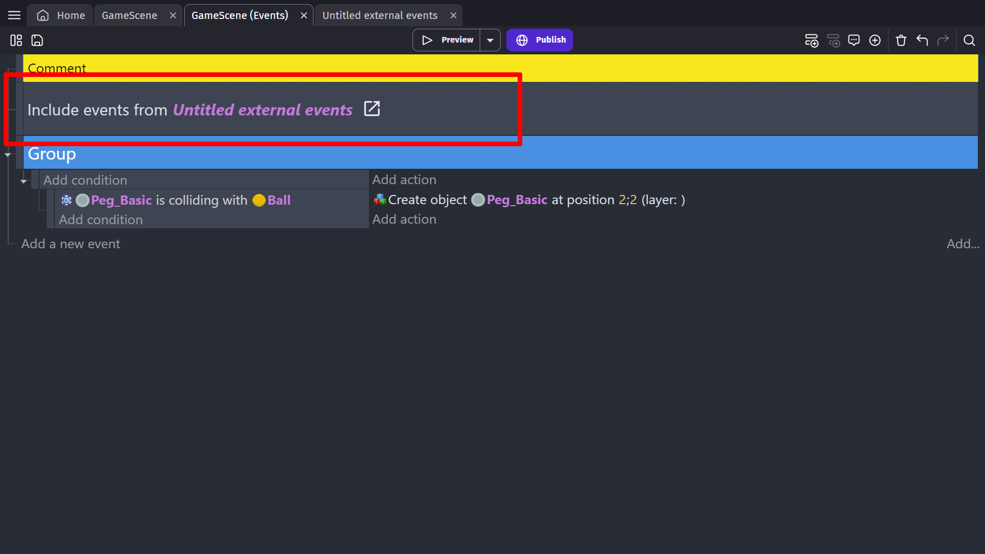 To open the linked event sheet, whether that's another scene in your game or an external event sheet, click on the arrow icon at the end of the linked event.