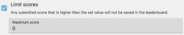 If you have a rough idea of the extreme achievable score (minimum score for lower is better configuration and maximum score for higher is better configuration), it is advised to set a score limit that will prevent any score submission that go past this limit from being saved in your leaderboard, thus avoiding obvious cheaters with impossible values.