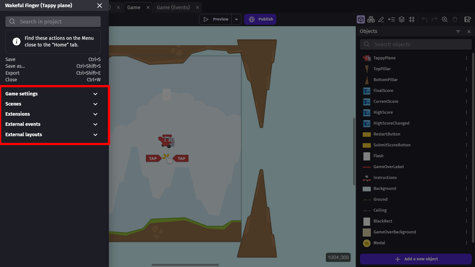 Game settings: This is where you can customize the global settings of the game. For example, the default size of the game window or the package name for Android and iOS. You can see all settings in "Properties". You can also set the icons for your game and manage the resources from the game.