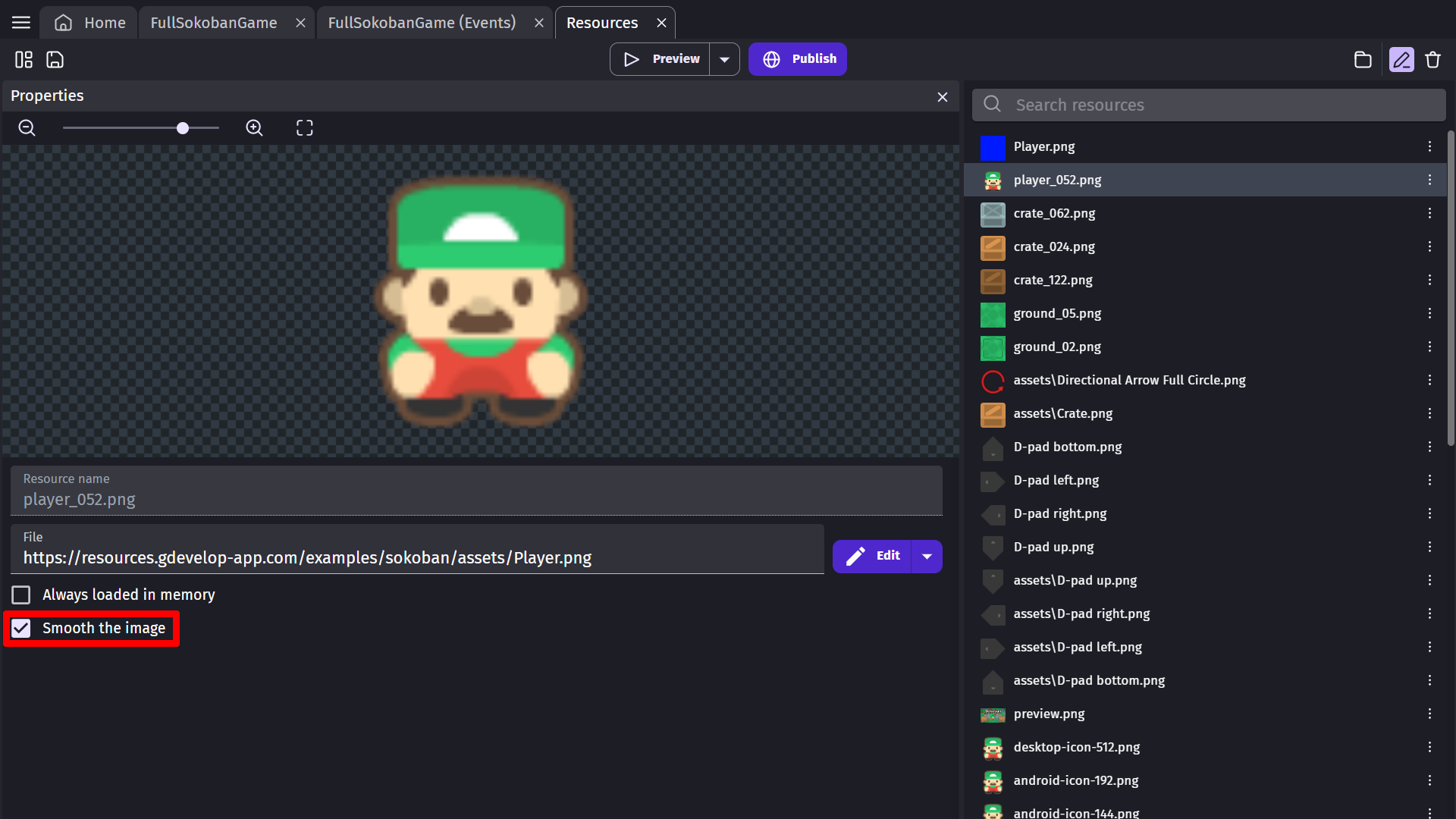 Images can appear blurry if they're scaled to a ratio they were not meant to be, or scaled at the correct ratio but to the wrong size. Image smoothing can help with scaling in any game that does not use pixel art. You can disable/enable image smoothing by toggling the option Smooth the image for the object that is selected in the resource tab. When your project properties scale mode is set to linear, all assets added to the project will start with this toggled on. But if scale mode is set to nearest, all assets added to the project will start with this toggled off.