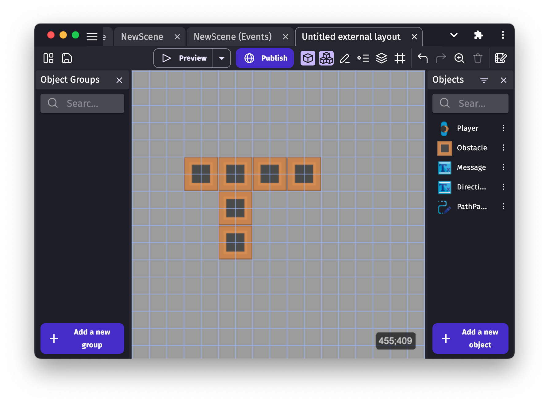 An external layout can be used to create a layout of objects, in the same way you would in a scene editor. Objects in an external layout can then be dynamically loaded into a scene using the action Create objects from an external layout.