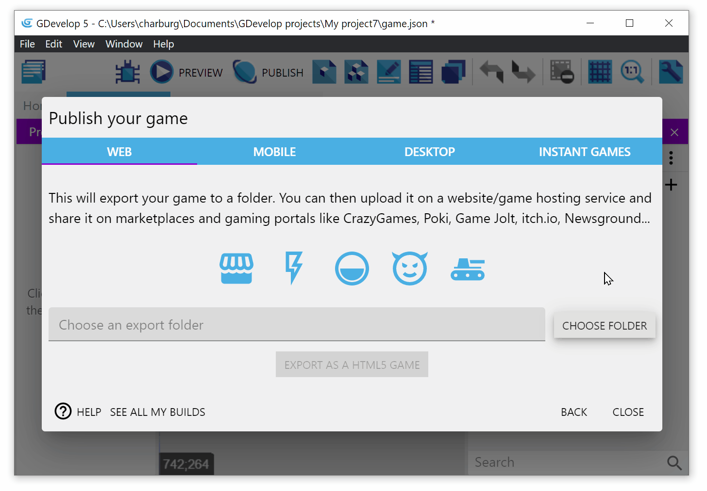 There, you can choose which folder you'd like to export to. Click Export as HTML5 Game once you're ready!