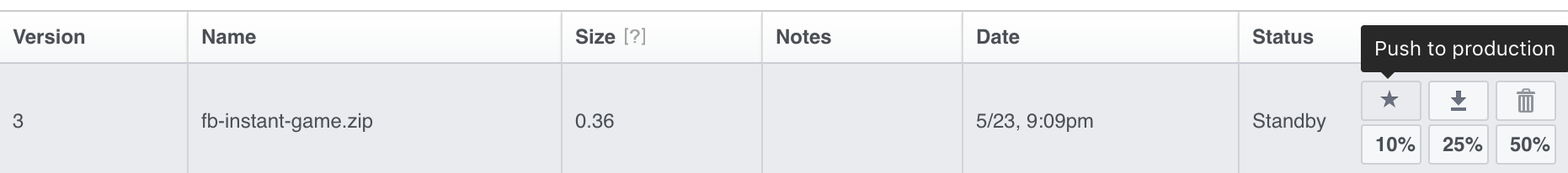 Click on Upload Version button on the right and choose the file that was created by GDevelop. When the upload is done, waiting a few seconds for Facebook to process your game.