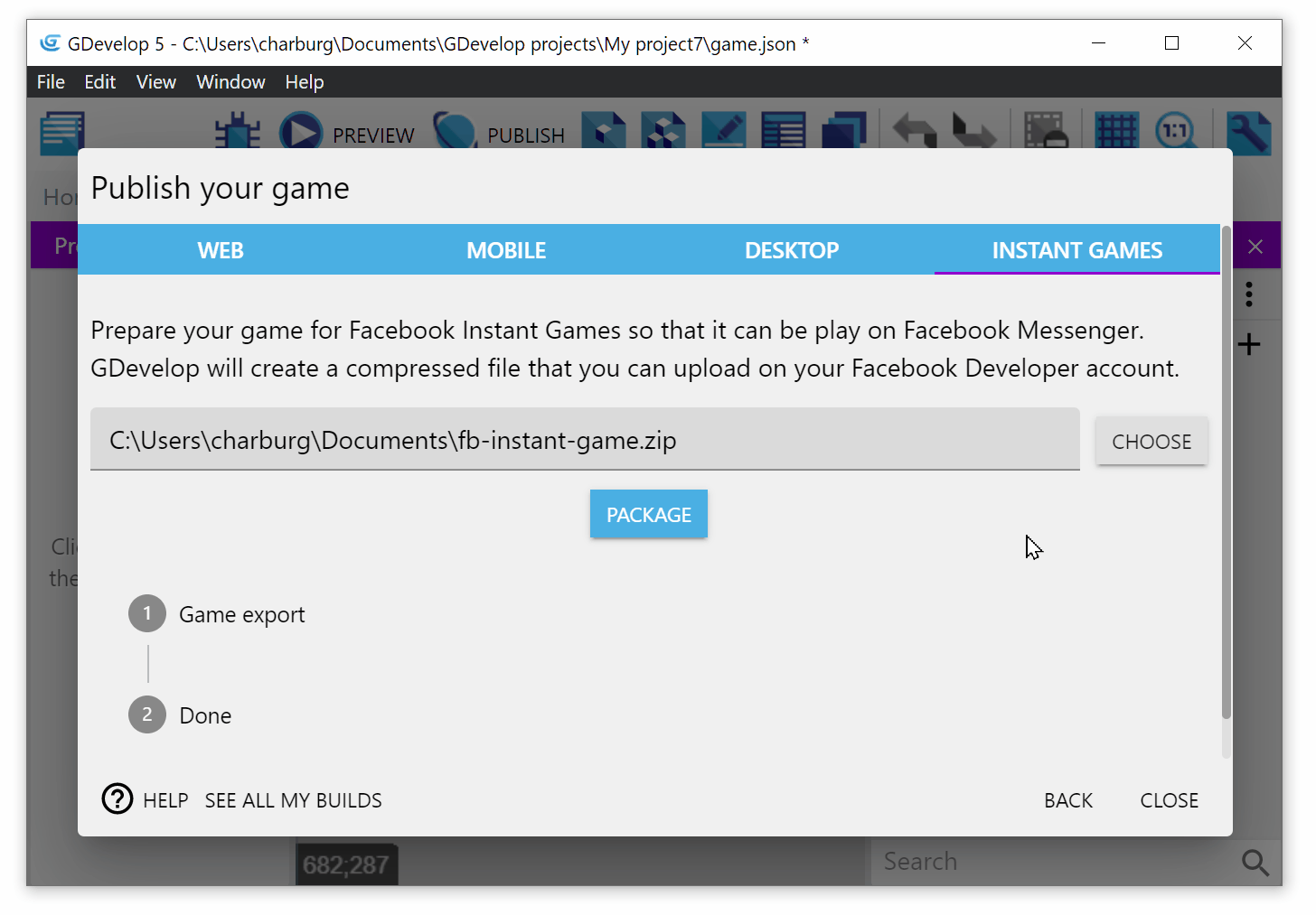 In GDevelop, open the export window. Choose Publish on stores underneath Publish your game, and then choose Instant Games.