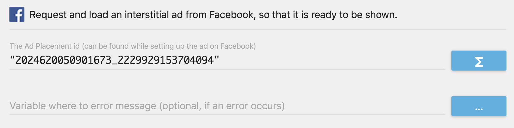 - Add an action "Load and prepare an interstitial ad" (in "Facebook Instant Games", "Ads").