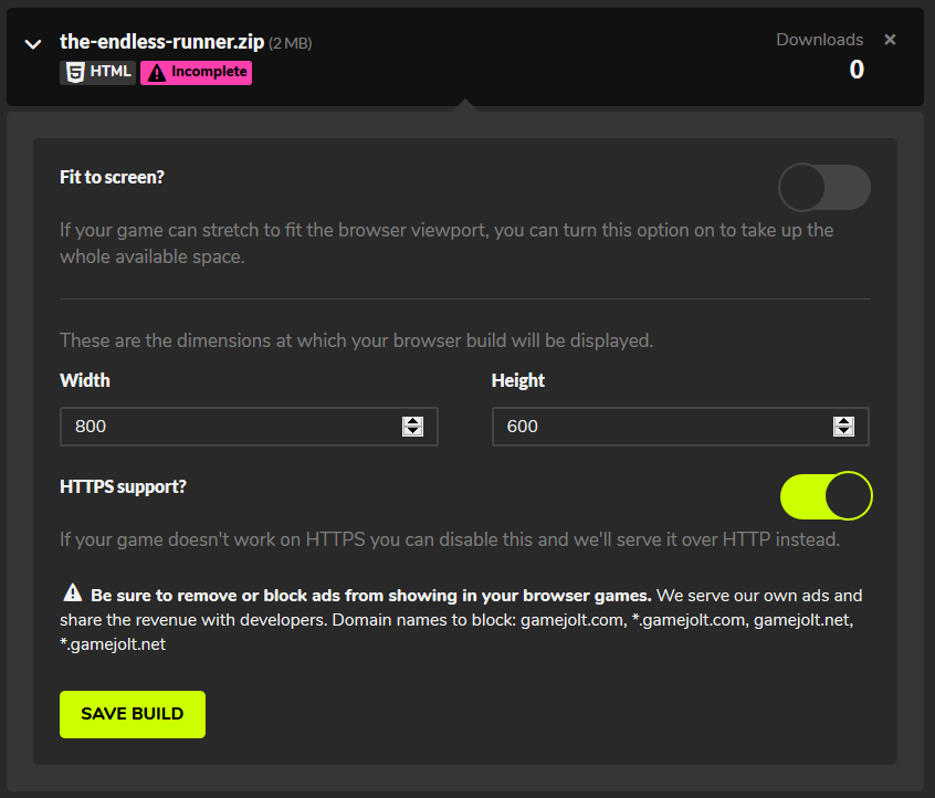 After the file has uploaded successfully, you will need to fill in the height and width specifications for your game. Click on Save Build