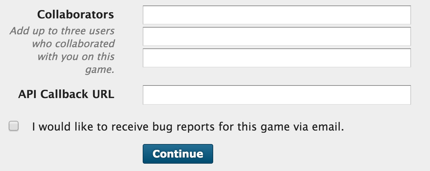 - API Callback URL: If your game is going to be utilizing one of our server APIs that requires a callback URL, this is where you will enter it.