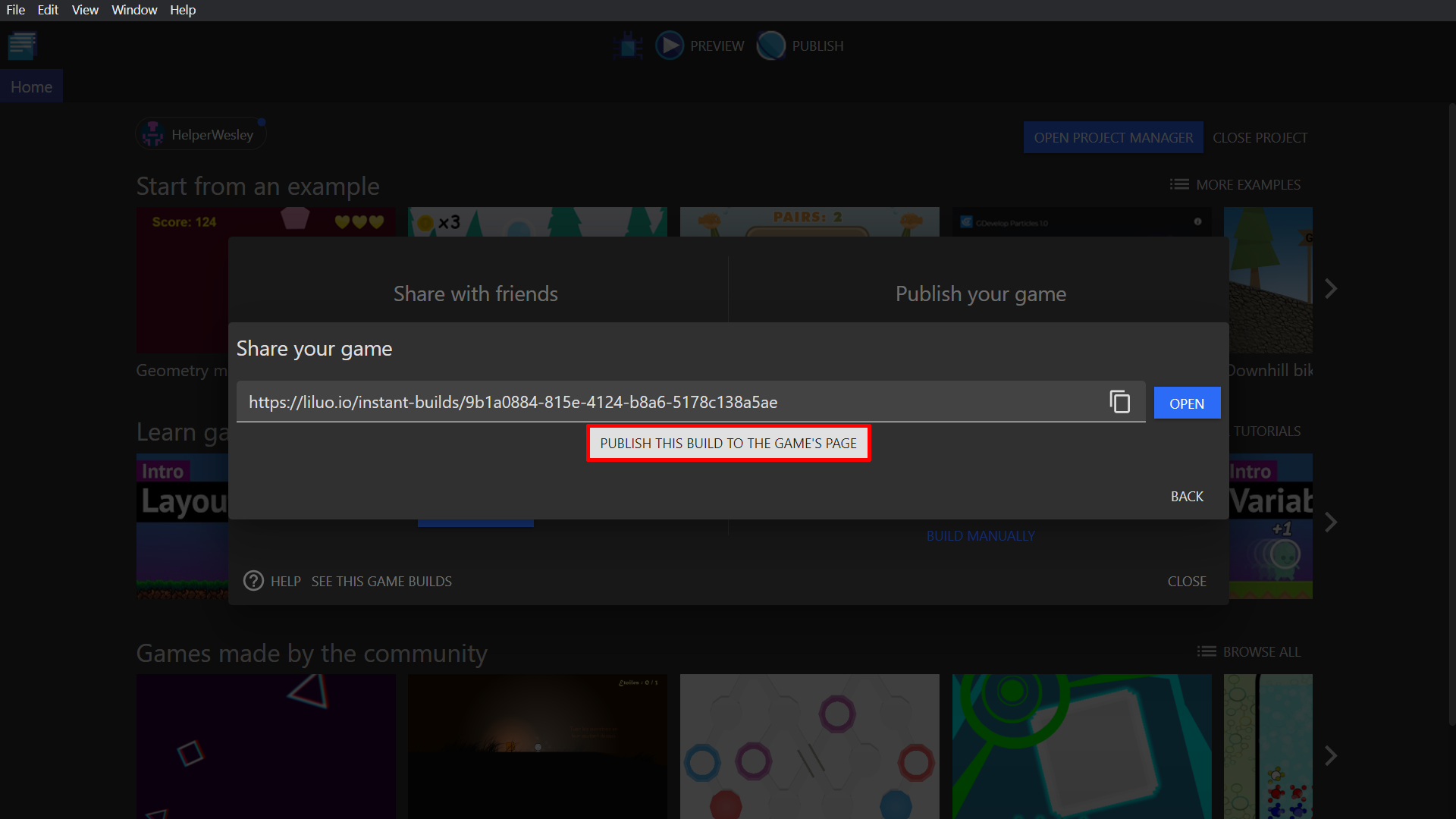 To post your game publicly on gd.games, click on the "publish this build to the game's page" button below the link. gd.games is GDevelop's game hosting platform, where free games created with GDevelop can be shared and played.