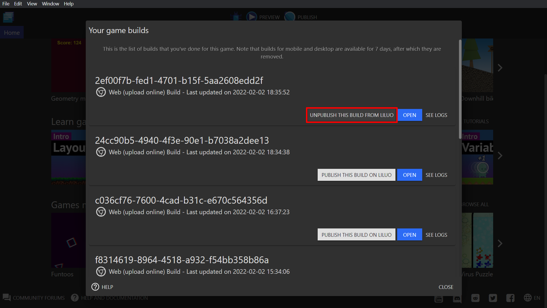 If you want to take your game off of gd.games for any reason, you can do that from the game builds menu. Just access the builds menu from your profile of through the export window, and click "Unpublish this build from gd.games".