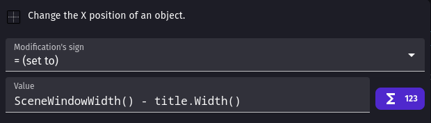 To center your text in the scene window, use the Center X position action with a value of SceneWindowWidth() / 2