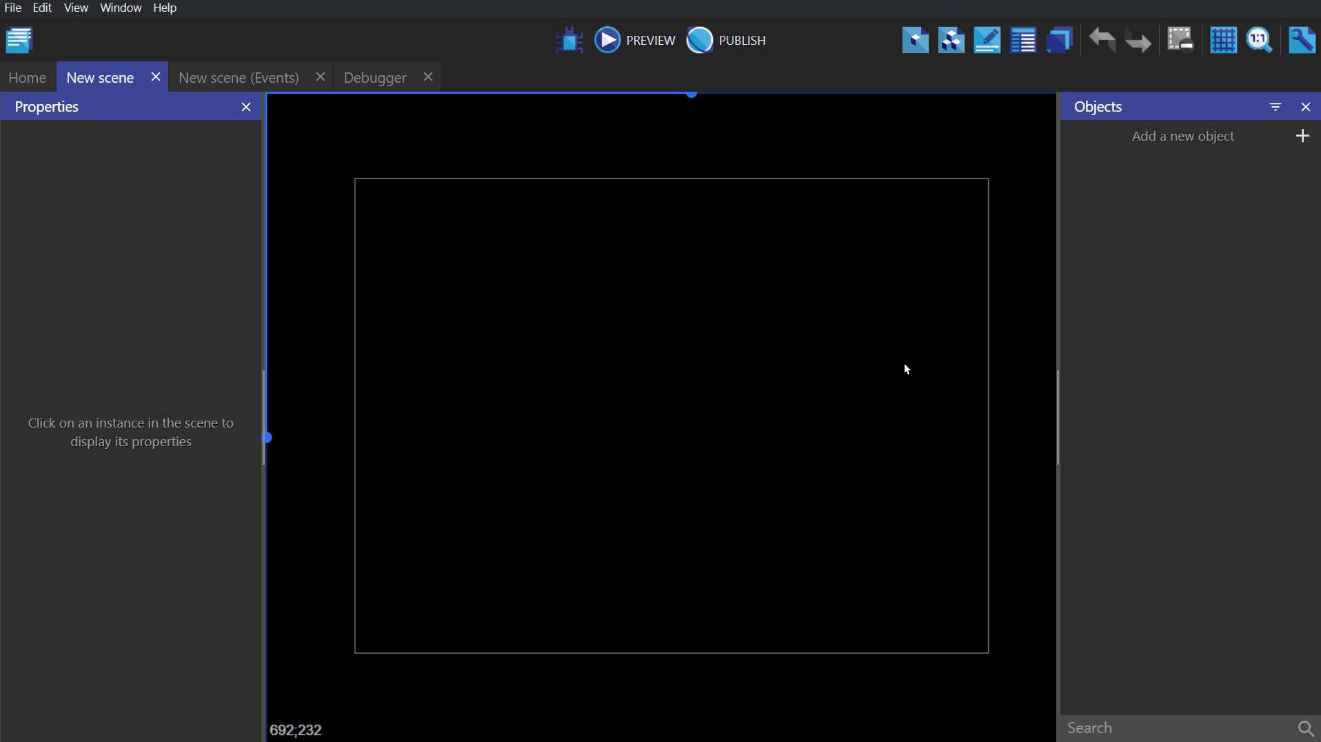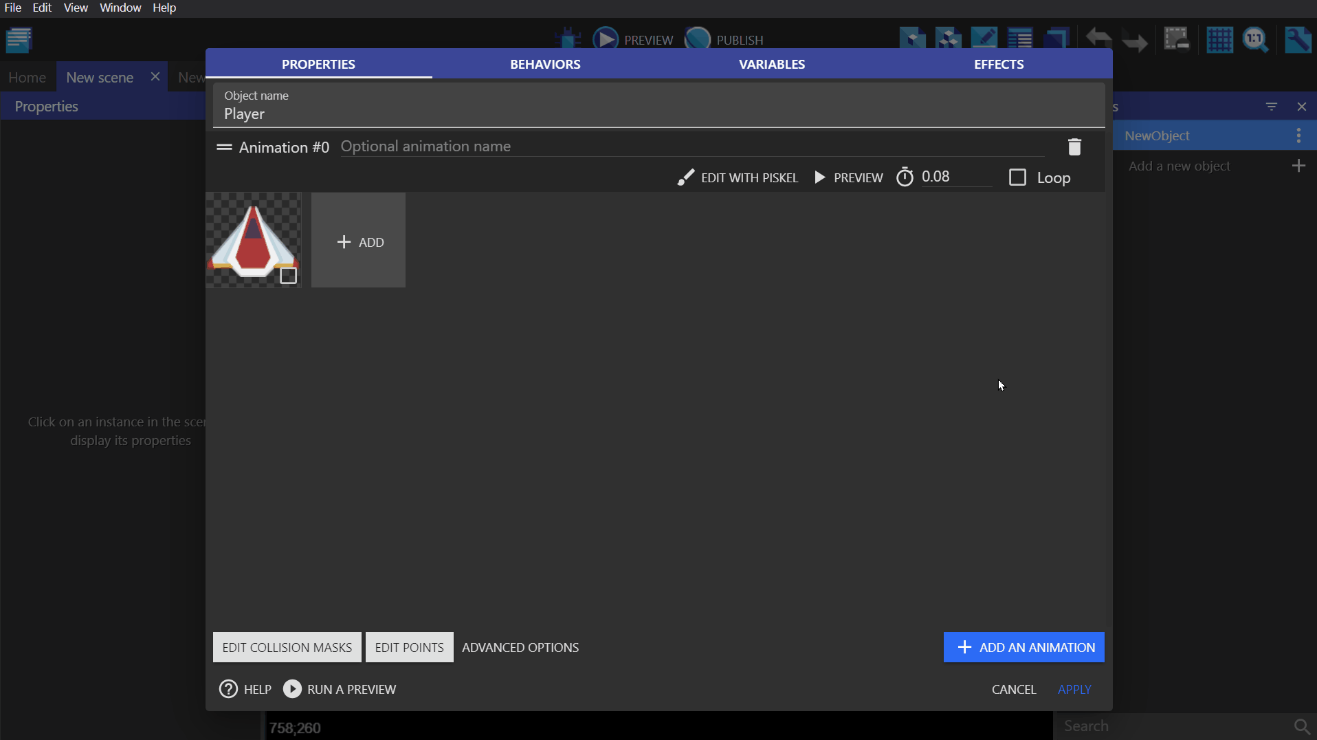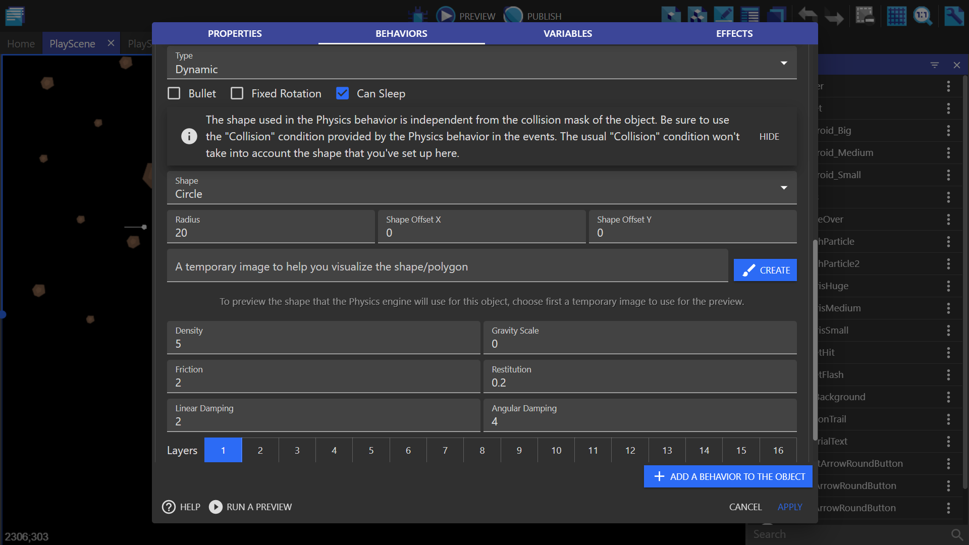 Next, edit the Player object's origin point from the Edit points screen. Drag the origin to the center of the object, so that when we apply a force to the object it will be applied at this point.