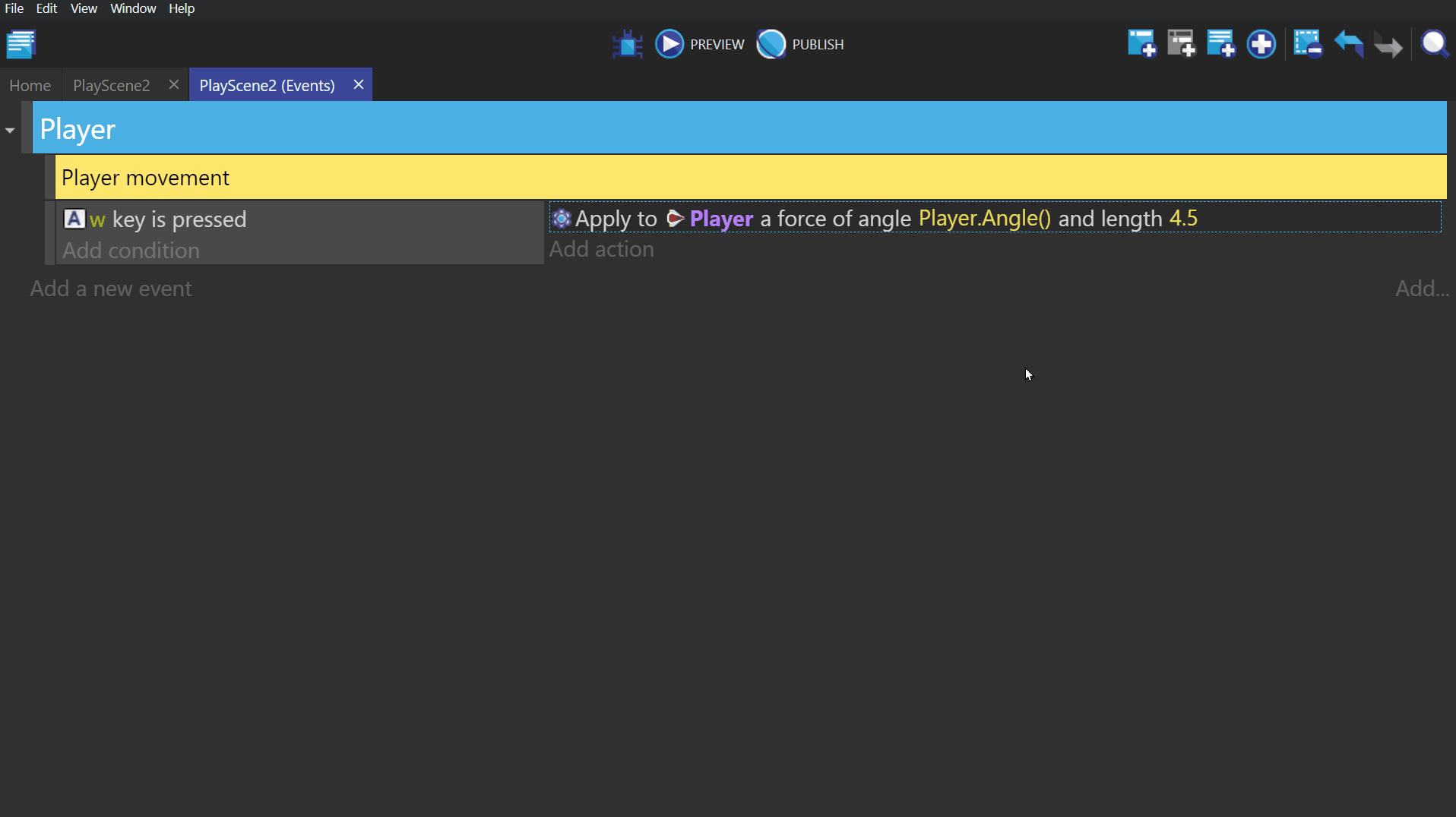 Action: -"Apply force (angle)" where the angle is the Player object's angle, the length is 4.5, and the applying X/Y position are those of the Player object.